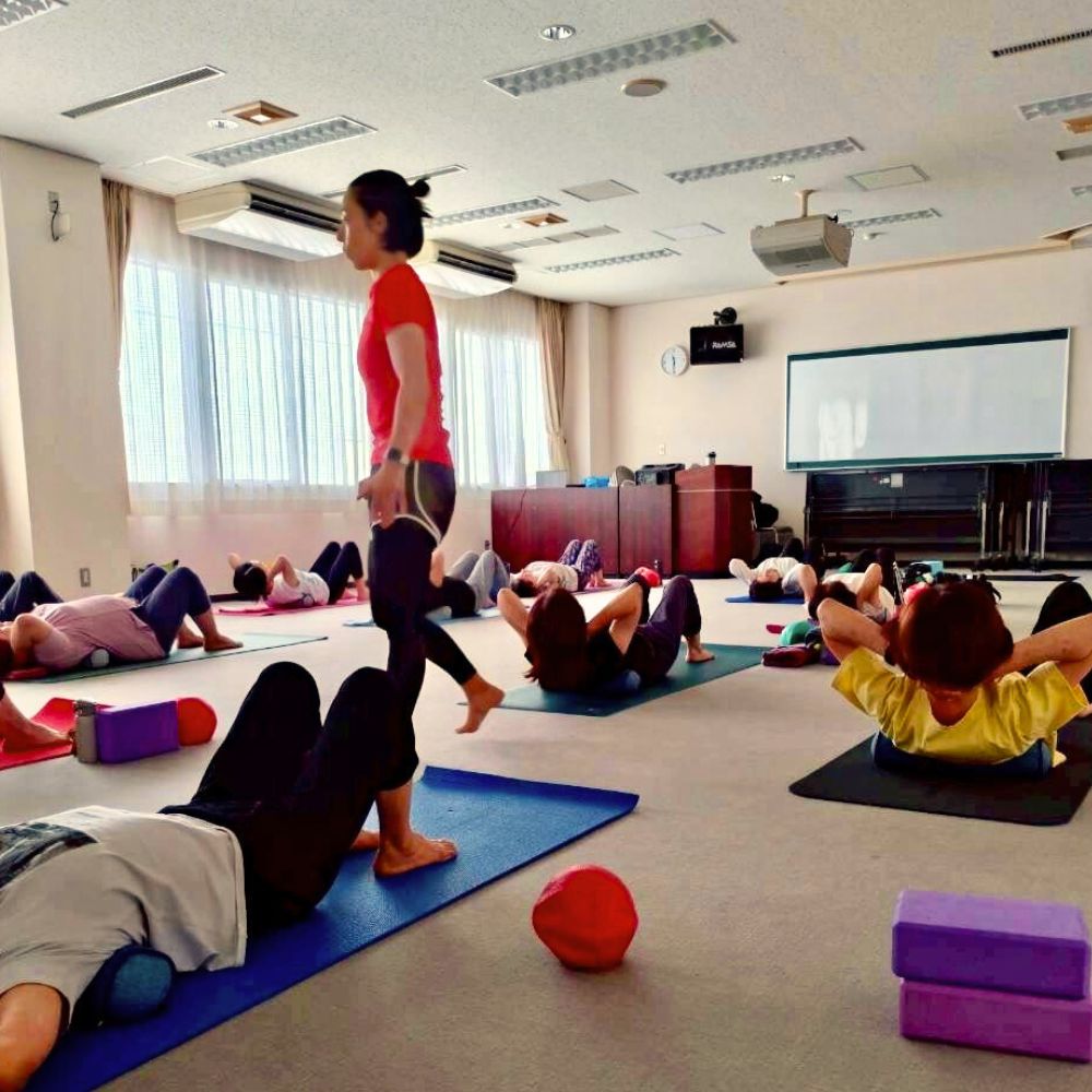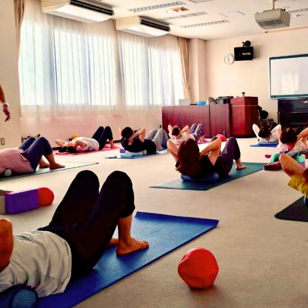 中高年向けレッスンで、弊社の骨盤スリムストレッチクッションを使っていただいている様子です。